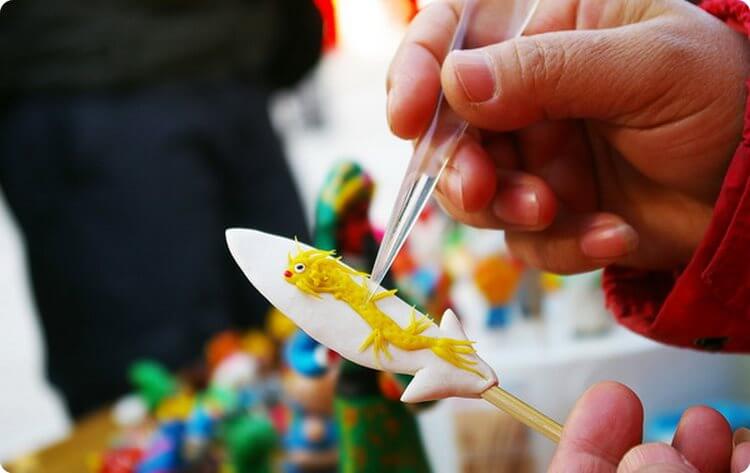 Dough modeling is another traditional folk art handed down from ancient times. Kneaded in half-cooked glutinous rice flour, dough figures, flowers and birds are popular small toys and exhibits in Beijing.The dough toy is made of flour and sweet rice flour, and has high artistic value. With a small bamboo knife, the artist can make dough shaped as people and animals in a short time. Among these figures are beautiful princesses, adorable children and various historical people.